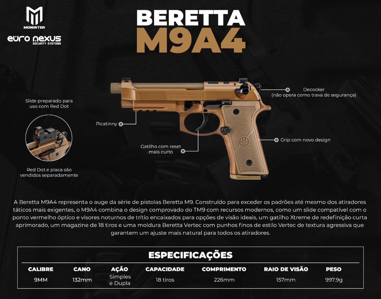 Cano roscado de fábrica e ferrolho optic ready para instalação de red dot fazem da M9A4 uma plataforma moderna, precisa e pronta para supressor. Possui trilho Picatinny para acessórios.